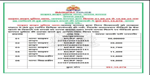 बागपत, 18 अगस्त (हि.स.)। बागपत जिले में साइबर थाना पुलिस ने साइबर ठगी करने वालों पर कड़ी कारवाई की है। पुलिस द्वारा करीब 51 लाख 15 हजार 79 रुपये बरामद कर पीड़ितों को वापस कराए गए हैं। बागपत पुलिस ने पिछले 15 दिनों में दर्ज किए गए 6 मामलों पर कार्रवाई करते हुए साइबर पुलिस टीम ने 51 लाख 15 हजार 79 रुपए बरामद कर पीड़ितों को वापस कराए हैं। एसपी बागपत सूरज कुमार राय का कहना है कि बागपत में साइबर अपराधियों के खिलाफ साइबर थाना पुलिस कड़ी मेहनत के साथ कार्य कर रही है। दर्ज किए गए मामलों पर तुरंत संज्ञान लेते हुए 6 मामलों में 51 लाख रुपए से अधिक वापस कराए गए हैं। इन अभियानों में सक्रिय रहे पुलिस कर्मियों को 10000 रुपये नगद पुरस्कार दिया गया है। जनपद के लोगों से साइबर अपराध के प्रति सजग रहने की अपील की गई है । विभिन्न माध्यमों से लोगों को जागरूक करने का कार्य भी साइबर सेल द्वारा किया जा रहा है।