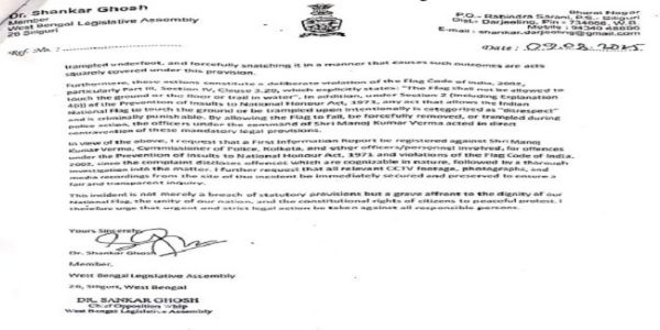 शिकायत में आरोप है कि शांतिपूर्ण नवान्न अभियान के दौरान प्रदर्शनकारियों के हाथ से भारतीय राष्ट्रीय ध्वज छीनकर पुलिसकर्मियों ने उसे जमीन पर फेंक दिया और रौंदा, जो राष्ट्रीय ध्वज का गंभीर अपमान है। भाजपा नेताओं के मुताबिक, यह घटना पुलिस आयुक्त के निर्देश पर हुई।