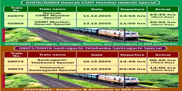रेलवे द्वारा जारी बयान के अनुसार, हावड़ा–मुंबई, मुंबई–हावड़ा तथा संतरागाछी–येलहंका रूट पर निम्नलिखित विशेष ट्रेनों का संचालन किया जाएगा—