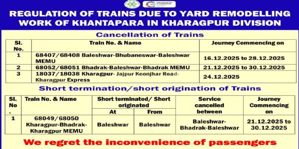 वहीं 68049/68050 खड़गपुर–भद्रक–खड़गपुर मेमू का परिचालन 21 दिसंबर से 30 दिसंबर 2025 तक आंशिक रूप से किया जाएगा। यह ट्रेन इस अवधि में बालेश्वर तक ही संचालित होगी तथा बालेश्वर–भद्रक–बालेश्वर खंड में सेवा रद्द रहेगी।