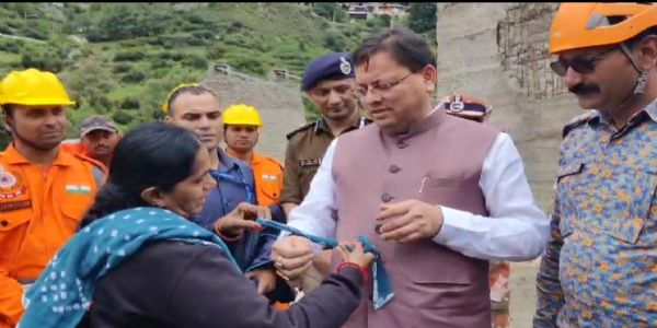 उत्तरकाशी, 8 अगस्त (हि.स.)। उत्तराखंड के उत्तरकाशी जिले के धराली में आपदा प्रभावित क्षेत्रों का निरीक्षण के दौरान शुक्रवार काे एक महिला ने अपनी साड़ी का किनारा फाड़ कर मुख्यमंत्री पुष्कर सिंह धामी की कलाई पर राखी के रूप में बांध दिया। महिला ने अपने पूरे परिवार का रेस्क्यू कर सुरक्षित बचाने के लिए मुख्यमंत्री का आभार जताया।