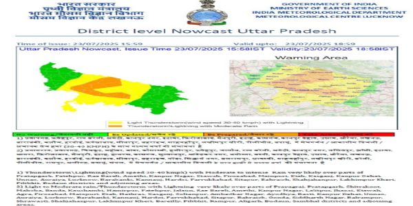 मौसम विज्ञान विभाग की ओर से जारी अलर्ट के मुताबिक प्रयागराज, प्रतापगढ़, चित्रकूट, महोबा, बांदा, कौशाम्बी, हमीरपुर, फतेहपुर, जालौन, रायबरेली, अमेठी, कानपुर नगर, ललितपुर, झांसी, इटावा, आगरा, फिरोजाबाद, मैनपुरी, इटावा हाथरस, कासगंज, सुल्तानपुर, अम्बेडकर नगर, अयोध्या, बस्ती, कानपुर देहात, उन्नाव, औरैया, लखनऊ, बाराबंकी, कन्नौज, हरदोई, फर्रुखाबाद, सीतापुर, बहराइच, गोंडा, सिद्धार्थनगर, बलरामपुर, श्रावस्ती, शाहजहांपुर, लखीमपुर खीरी, बरेली, पीलीभीत, रामपुर, अलीगढ़, बदायूं, संभल में मेघ गर्जन और अचानक तेज हवाओं के साथ हल्की से मध्यम वर्षा की संभावना है।--------------