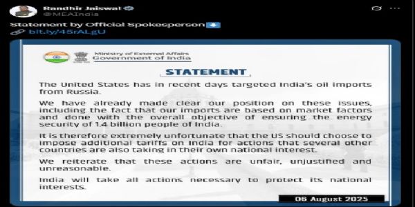 अतिरिक्त टैरिफ की घोषणा को भारत ने दुर्भाग्यपूर्ण बताते हुए कहा कि हाल के दिनों में अमेरिका ने रूस से भारत के तेल आयात को निशाना बनाया है। इन मुद्दों पर भारत पहले ही अपना रुख स्पष्ट कर चुका है। जिसमें यह तथ्य शामिल है कि भारत का आयात बाजार की परिस्थितियों पर आधारित है और इसका उद्देश्य भारत की एक अरब 40 करोड़ आबादी की ऊर्जा सुरक्षा सुनिश्चित करना है। अमेरिका ने भारत पर अतिरिक्त टैरिफ का फैसला किया है, जबकि कई अन्य देश अपने राष्ट्रीय हित में वही काम कर रहे हैं। भारत ने इसे अनुचित, तर्कहीन और अकारण बताते हुए कहा कि अपने राष्ट्रीय हितों की रक्षा के लिए सभी आवश्यक कदम उठाए जाएंगे।