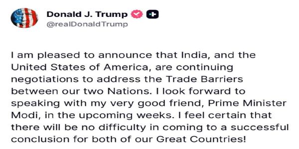 ब्लूमबर्ग डॉट कॉम के अनुसार, ट्रंप ने नौ सितंबर को सोशल मीडिया पर लिखा, मुझे यह घोषणा करते हुए खुशी हो रही है कि भारत और संयुक्त राज्य अमेरिका अपने दोनों देशों के बीच व्यापार बाधाओं को दूर करने के लिए बातचीत जारी रखे हुए हैं। मैं आने वाले हफ्तों में अपने बहुत अच्छे दोस्त प्रधानमंत्री मोदी से बात करने के लिए उत्सुक हूं। मुझे पूरा विश्वास है कि हमारे दोनों महान देशों के लिए एक सफल निष्कर्ष पर पहुंचने में कोई कठिनाई नहीं होगी!