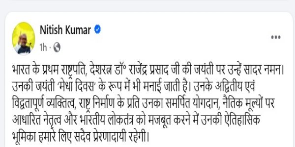 इस अवसर पर जारी अपने संदेश में उन्होंने कहा कि भारत के प्रथम राष्ट्रपति, देशरत्न डॉ राजेंद्र प्रसाद की जयंती पर उन्हें सादर नमन। उनकी जयंती ‘मेधा दिवस’ के रूप में भी मनाई जाती है।