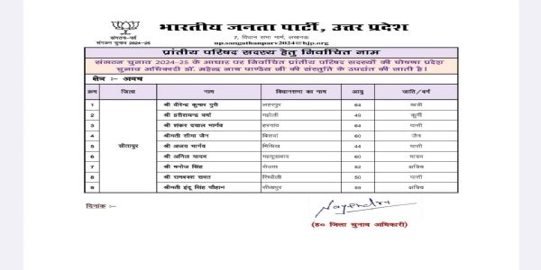 सीतापुर, 09 दिसम्बर (हि.स.)। भारतीय जनता पार्टी के संगठन-पर्व के तहत चल रहे संगठन चुनाव 2024-25 में प्रांतीय परिषद सदस्यों की सूची औपचारिक रूप से मंगलवार शाम को घोषित कर दी गई है। प्रदेश चुनाव अधिकारी डॉ. महेंद्र नाथ पांडेय की संस्तुति के बाद प्रदेश नेतृत्व ने यह सूची फाइनल जारी की। भाजपा जिलाध्यक्ष ने मंगलवार शाम इसकी पुष्टि करते हुए बताया कि जिला संगठन चुनाव अधिकारी नागेंद्र गुप्ता की सहमति से जनपद से चुने गए प्रांतीय परिषद सदस्यों के नाम संगठन को भेज दिए गए हैं, जिन्हें प्रदेश नेतृत्व ने आज स्वीकृति प्रदान कर दी है।
