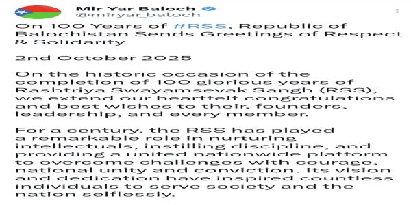 बलाेचिस्तान मुक्ति आंदोलन के सक्रिय कार्यकर्ता मीर यार बलाेच ने गुरूवार काे संघ काे भेजे संदेश में कहा, संगठन के गौरवशाली 100 वर्ष पूरे होने के ऐतिहासिक अवसर पर हम इसके संस्थापकों, नेतृत्व और प्रत्येक सदस्य को हार्दिक बधाई और शुभकामनाएं देते हैं।