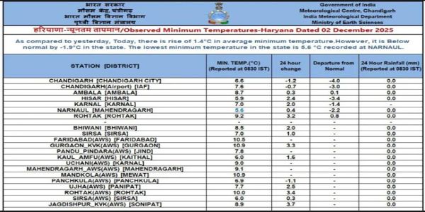 पिछले दो दिनों से प्रदेशभर में सुबह और रात में ठिठुरन काफी बढ़ी है। उत्तरी पर्वतीय क्षेत्रों में जारी बर्फबारी और वहां से आने वाली सर्द हवाओं ने यहां के तापमान को सामान्य से लगभग दो डिग्री नीचे ला दिया है। जबकि नारनौल का न्यूनतम तापमान सामान्य से तीन डिग्री कम दर्ज हुआ और शुष्क हवाओं ने सुबह का माहौल और भी ठंडा कर दिया। जिले के अन्य हिस्सों में भी मौसम का असर अलग-अलग रहा।