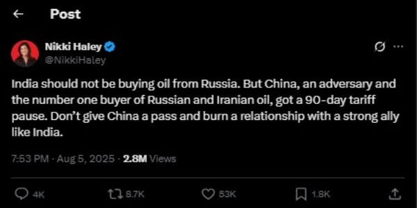 टैरिफ को लेकर भारत अमेरिका तनाव पर भारतीय मूल की पूर्व अमेरिकी राजदूत निक्की हेली ने राष्ट्रपति डोनाल्ड ट्रंप को अहम सलाह देते हुए कहा कि इससे दोनों देशों के बीच लंबे समय से चली आ रही मित्रता में खटास आने का जोखिम है उन्होंने ट्रंप पर दोहरा रवैया अपनाने का आरोप लगाते हुए एक्स पोस्ट में लिखा-“भारत को रूस से तेल नहीं खरीदना चाहिए लेकिन रूस व ईरान के सबसे बड़े तेल खरीदार चीन को 90 दिनों की टैरिफ छूट मिल गई।भारत जैसे मजबूत सहयोगी से रिश्ते बिगाड़ कर चीन को छूट न दें।”