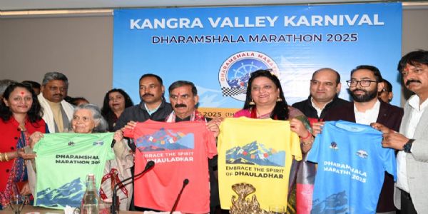 धर्मशाला, 02 दिसंबर (हि.स.)। मुख्यमंत्री ठाकुर सुखविंद्र सिंह सुक्खू ने मंगलवार को धर्मशाला में मैराथन-2025 की आधिकारिक जर्सी लांच की। यह आयोजन 25 दिसम्बर, 2025 को प्रस्तावित है। इस आयोजन का उद्देश्य शारीरिक तंदरुस्ती को बढ़ावा देना, खेल पर्यटन को सशक्त बनाना और धौलाधार की मनोरम पहाड़ियों की सुंदरता को उजागर करना है। उपस्थित लोगों ने धौलाधार पर्वतमाला तथा क्षेत्र की जीवंत सांस्कृतिक विरासत से प्रेरित जर्सी के डिज़ाईन की सराहना की।