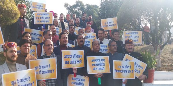 धर्मशाला, 04 दिसंबर (हि.स.)। धर्मशाला के तपोवन में चल रहे विधानसभा के शीत सत्र में कभी विपक्ष तो कभी सत्तापक्ष द्वारा विभिन्न मुद्दों को लेकर विरोध प्रदर्शन का दौर वीरवार को सातवें दिन भी जारी रहा। वीरवार को एक बार फिर सत्र शुरू होने से पूर्व विपक्षी दल भाजपा के विधायकों ने नेता प्रतिपक्ष जयराम ठाकुर के नेतृत्व में प्रदेश की कांग्रेस सरकार के खिलाफ विरोध प्रदर्शन किया। विधानसभा शीतकालीन सत्र के सातवें दिन सत्र शुरू होने से पहले सुबह हाथों में बैनर लेकर भाजपा विधायकों ने सरकार के खिलाफ विरोध प्रदर्शन किया। जश्न मनाना बंद करो, राहत का प्रबंध करो और धारा 118 खेल है, हिमाचल का सेल है, जैसे नारे लगाते हुए विपक्ष के विधायक विपक्ष लॉन्ज से निकले और विधानसभा परिसर में जमकर नारेबाजी की।