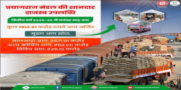 प्रयागराज, 04 दिसम्बर (हि.स.)। प्रयागराज रेल मण्डल ने वित्तीय वर्ष 2025-26 में नवम्बर माह तक कुल 1813.61 करोड़ रुपये आय अर्जन किया है। यह आय अर्जन गत वित्तीय वर्ष की इसी अवधि के आय अर्जन 1778.96 करोड़ रुपये से 1.95 प्रतिशत अधिक है। वित्तीय वर्ष में नवम्बर माह तक कुल मालभाड़ा आय से 571.01 करोड़ रुपये आय अर्जित की है। जब कि गत वित्तीय वर्ष की इसी अवधि की आय अर्जन 570.68 करोड़ रुपये थी।