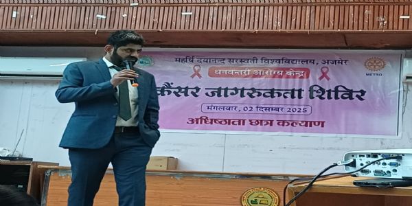 अजमेर, 2 दिसम्बर(हि.स.)। महर्षि दयानंद सरस्वती विश्वविद्यालय के धन्वंतरि आरोग्य केंद्र एवं रोटरी क्लब मेट्रो के संयुक्त तत्वावधान में विश्वविद्यालय परिसर में कैंसर जागरुकता शिविर का आयोजन किया गया। शिविर का उद्देश्य विश्वविद्यालय परिवार, विद्यार्थियों एवं आमजन को कैंसर के कारणों, रोकथाम, बचाव एवं समय पर पहचान के महत्व से अवगत कराना था।