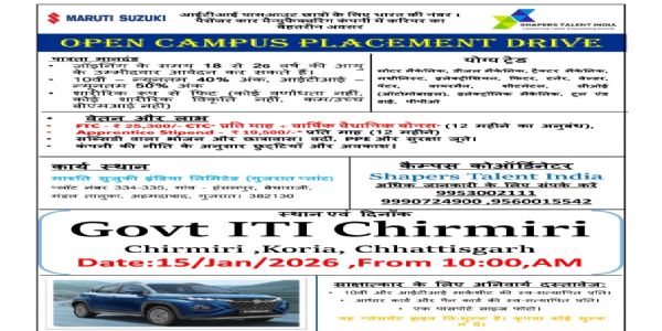मनेंद्रगढ़-चिरमिरी-भरतपुर, 01 जनवरी (हि.स.)। आईटीआई उत्तीर्ण युवाओं को रोजगार से जोड़ने के उद्देश्य से भारत सरकार के निर्देशानुसार देश की अग्रणी पैसेंजर कार निर्माता कंपनी मारुति सुजुकी इंडिया लिमिटेड द्वारा मनेंद्रगढ़-चिरमिरी-भरतपुर जिले के शासकीय औद्योगिक प्रशिक्षण संस्था चिरमिरी में ओपन कैंपस प्लेसमेंट ड्राइव का आयोजन किया जा रहा है। यह प्लेसमेंट ड्राइव 15 जनवरी 2026 को प्रातः 10 बजे शासकीय आईटीआई चिरमिरी में आयोजित होगी, जिसमें जिले सहित आसपास के क्षेत्रों के आईटीआई पासआउट अभ्यर्थियों को भाग लेने का अवसर मिलेगा।