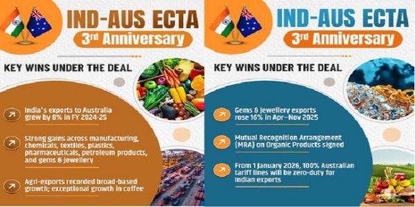 उन्होंने बताया कि अप्रैल-नवंबर 2025 में रत्न और आभूषण का निर्यात 16 फीसदी बढ़ा। ऑर्गेनिक प्रोडक्ट्स पर आपसी मान्यता समझौता (एमआरए) पर हस्ताक्षर किए गए, जिससे निर्बाध व्यापार संभव हुआ और निर्यातकों के लिए अनुपालन लागत कम हुई। गोयल ने कहा कि जैसे-जैसे व्यापक आर्थिक सहयोग समझौते (सीईसीए) की बातचीत आगे बढ़ रही है, भारत-ऑस्ट्रेलिया ईसीटीए मेक इन इंडिया और विकसित भारत 2047 के विजन के साथ मिलकर इंडो-पैसिफिक में भारत की आर्थिक भागीदारी को मजबूत कर रहा है। इसके साथ मिलकर भारत और ऑस्ट्रेलिया साझा समृद्धि और भरोसेमंद व्यापार का भविष्य बना रहे हैं।
