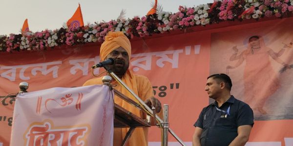 उन्होंने कहा कि संविधान के चौथे स्तंभ मीडिया पर भी हमला हो रहा है प्रशासनिक स्तर से ऐसे बयान दिए जा रहे हैं जिससे एक समूह काफ़ी उत्साहित हो रहा है। पश्चिम बंगाल में नाना भाषा, नाना मत, नाना परिधान. विविधता आई, कई सरकारे आई और गई। लेकिन वर्तमान में सत्तारूढ़ जैसी सरकार पश्चिम बंगाल कभी देखने को नहीं मिला। जिस दिन से पश्चिम बंगाल में इमाम भत्ता चालू हुआ है उसके बाद एक विशेष समुदाय खुद को दुधारू गाय मानने लगा है। एक निर्वाचित विधायक 70 प्रतिशत और 30 प्रतिशत की बात कर रहे हैं और एक दूसरा भाग बंटवारा करने की बात कर रहा है। हम तो सन्यासी है प्राकृतिक आपदा और बाढ़ की स्थिति में जाति, धर्म, वर्ण से ऊपर हो उठकर सेवा का कार्य करते हैं। हमारे सनातन धर्म पर हमला हो रहा है। इसलिए हम रास्ते पर उतरे हैं।
