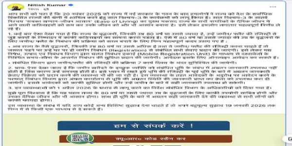 मुख्यमंत्री नीतीश कुमार ने मंगलवार को सोशल मीडिया प्लेटफॉर्म एक्स पर पोस्ट कर जानकारी दी कि सात निश्चय-3 के सातवें निश्चय ‘सबका सम्मान–जीवन आसान’ के तहत 80 वर्ष या उससे अधिक आयु के वृद्धजनों के लिए जमीन और फ्लैट के निबंधन की प्रक्रिया को सरल किया जा रहा है। इसके तहत अब घर पर ही निबंधन से जुड़ी सभी सेवाएं उपलब्ध कराई जाएंगी।