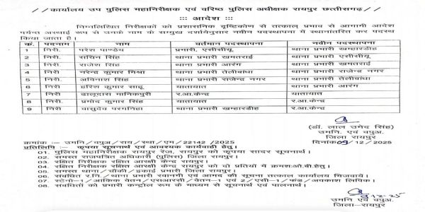 इसी प्रकार यातायात प्रभारी हरित कुमार साहू को आरंग का थाना प्रभारी, ढालूदास मानिकपुरी को यातायात, प्रमोद कुमार सिंह को रक्षित केंद्र और वासुदेव परमनिहा को भी खम्हारडीह थाने से हटाकर रक्षित केंद्र भेजा गया है।