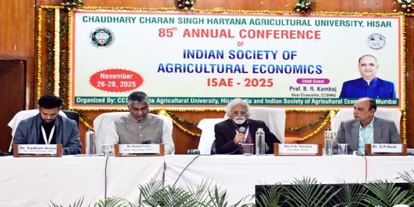 एचएयू में इंडियन सोसाइटी ऑफ़ एग्रीकल्चर इकोनॉमिक्स सम्मेलन का समापन हिसार, 28 नवंबर (हि.स.)। हरियाणा कृषि विश्वविद्यालय में आयोजित तीन दिवसीय 85वें इंडियन सोसाइटी ऑफ़ एग्रीकल्चर इकोनॉमिक्स (आईएसएई) के वार्षिक सम्मेलन का समापन हुआ। आईएसएई के चेयरमैन प्रो. दिनेश के मारोठिया कार्यक्रम में बतौर मुख्य अतिथि जबकि मंच पर सचिव डॉ. कमल वाटा, कृषि महाविद्यालय के अर्थशास्त्र विभागाध्यक्ष डॉ. डीपी मलिक व डॉ. कशिश अरोड़ा उपस्थित रहे।प्रो. दिनेश के. मारोठिया ने शुक्रवार काे कहा कि सकल घरेलू उत्पाद (जीडीपी) में कृषि का अह्म योगदान है। सतत कृषि से किसानों की लागत कम होगी और आय में बढ़ोतरी होगी। फसल विविधीकरण से बाजार के उतार-चढ़ाव से बचा जा सकता है। जिससे जोखिम कम होगा और खेती आर्थिक रूप से टिकाऊ और मजबूत होगी। उन्होंने बताया कि भारत के सकल घरेलू उत्पाद में कृषि का अह्म योगदान है। ग्रामीण क्षेत्रों में समावेशी विकास सुनिश्चित करने हेतु संस्थागत नवाचारों और सामुदायिक भागीदारी को अहम बताया गया। उन्होंने बताया कि जलवायु परिवर्तन के मध्यनजर संसाधन संरक्षण, जल प्रबंधन और हरित तकनीक को बढ़ावा देने की सिफारिश की गई। किसानों की बाजारों तक पहुंच सुनिश्चित करने के लिए मूल्य निर्धारण, जोखिम प्रबंधन और निर्यात संभावनाओं को मजबूत करने पर विस्तार से चर्चा की गई। कार्यक्रम में उत्कृष्ट शोध पत्र प्रस्तुत करने वाले वैज्ञानिकों को सम्मानित किया गया। इन वैज्ञानिकों में डॉ. शैलेन्द्र कुमार व डॉ. समिता सिरोही को फैलो आईएसएई, जोन्स जी टियांडल, अक्षय देशमूख व पूजा चंद्रन को डॉ. एनए मजूमदार अवार्ड से सम्मानित किया गया। इसी प्रकार दीपांजन कश्यप को प्रोफेसर एसएस जोहल अवार्ड, अंकित कुमार सिंह को डीके देसाई अवार्ड तथा बोन्दिता सिक्का को अनामित्रा साहा अवार्ड से सम्मानित किया गया। डॉ. डीपी मलिक ने सम्मेलन में सभी का धन्यवाद किया। मंच का संचालन जैव प्रौद्योगिकी महाविद्यालय की सहायक प्राध्यापक डॉ. कनिका ने किया।