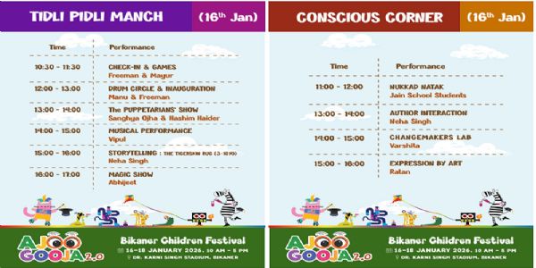 जिला कलेक्टर नम्रता वृष्णि ने बताया कि जिले में दूसरी बार आयोजित हो रहे बीकानेर चिल़्ड्रन फेस्टिवल- आजू गूजा का आयोजन डॉ.करणी सिंह स्टेडियम में 16 से 18 जनवरी तक किया जाएगा। फेस्टिवल का समय सुबह 10 से शाम 5 बजे तक रखा गया है। फेस्टिवल में 3 से 14 साल तक के बच्चे हिस्सा ले सकेंगे। 80 से ज़्यादा गतिविधियां आयोजित की जायेंगी। उन्होंने बताया कि बच्चों के परिजन बच्चों के साथ आ सकेंगे। केवल परिजनों का मेले में प्रवेश वर्जित रहेगा।