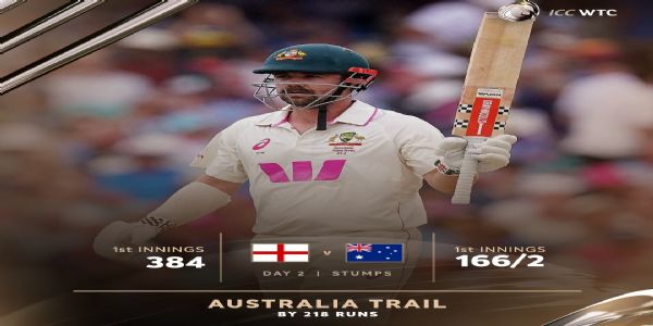 जवाब में ऑस्ट्रेलिया ने मजबूत शुरुआत की है। दूसरे दिन का खेल समाप्त होने तक टीम ने 2 विकेट के नुकसान पर 166 रन बना लिए हैं। ट्रेविस हेड 87 गेंदों में नाबाद 91 रन बनाकर शानदार लय में नजर आ रहे हैं, जबकि नाइट वॉचमैन के रूप में उतरे माइकल नेसर 15 गेंदों में एक रन बनाकर नाबाद हैं। सलामी बल्लेबाज जेक वेदराल्ड 21 रन और मार्नस लाबुशेन 48 रन बनाकर आउट हुए।