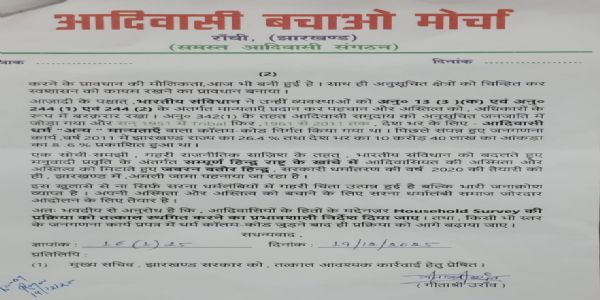 आदिवासी मोर्चा ने सीएस से मिलकर शिक्षा विभाग के सर्वे का जताया विरोध