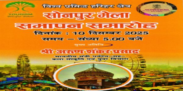 सारण, 10 दिसंबर (हि.स.)। एशिया के सबसे बड़े और विश्व प्रसिद्ध हरिहर क्षेत्र सोनपुर मेला का भव्य समापन समारोह आज जिला प्रशासन द्वारा आयोजित इस समारोह के साथ ही एक महीने तक चलने वाले इस ऐतिहासिक उत्सव का सफलतापूर्वक समापन आज शाम पांच बजे हो जाएगा।