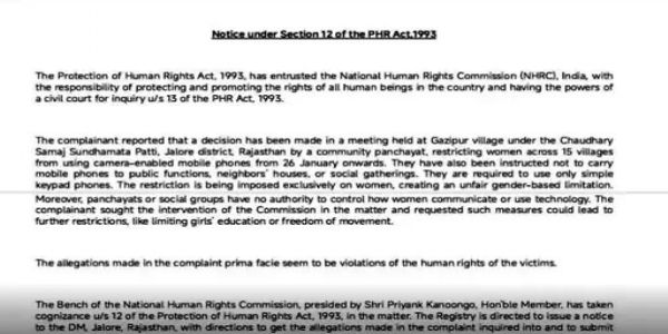मानवाधिकार आयोग ने नोटिस में साफ किया है कि यह प्रतिबंध केवल महिलाओं पर लागू किया गया, जो सीधे तौर पर लिंग आधारित भेदभाव को दर्शाता है। आयोग ने कहा कि पंचायतों या किसी भी सामाजिक समूह को महिलाओं के संचार साधनों या तकनीक के उपयोग को नियंत्रित करने का कोई अधिकार नहीं है।