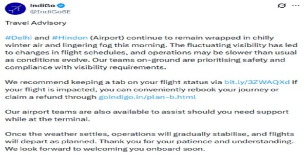 नई दिल्ली, 29 दिसंबर (हि.स.)। देश की विमान सेवा इंटर ग्लोब एविएशन लिमिटेड (इंडिगो) ने कहा कि आज सुबह दिल्ली और हिंडन के साथ-साथ जम्मू हवाई अड्डा में घना कोहरा छाया हुआ है। दृश्यता में उतार-चढ़ाव के कारण उड़ानों के निर्धारित समय( फ्लाइट शेड्यूल) में बदलाव किया गया। जैसे-जैसे मौसम साफ होगा, इसमें सुधार किया जाएगा।