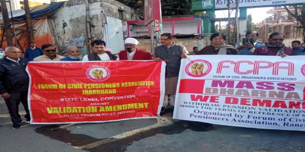 रांची, 10 जनवरी (हि.स.)। राष्ट्रीय आह्वान के तहत फोरम ऑफ सिविल पेंशनर्स एसोसिएशन, रांची के बैनर तले शनिवार को शहीद चौक, रांची में पेंशन अधिनियम में किए गए वैलिडेशन संशोधन और आठवें वेतन आयोग को भेजे गए टर्म ऑफ रेफरेंस के विरोध में जिला स्तरीय धरना का आयोजन किया गया।