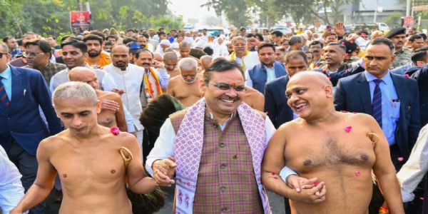 तत्पश्चात मुख्यमंत्री एवं सभी राजनेता दोनों आचार्य संघ के साथ बैण्ड बाजों के साथ पैदल विहार करते हुए विशाल जुलूस के रुप में मुख्यमंत्री कैम्प कार्यालय पहुंचे। जहां आचार्य ससंघ की भव्य अगवानी की गई । मार्ग में भगवान महावीर के जयकारों से आसपास का वातावरण गुंजायमान हो उठा।