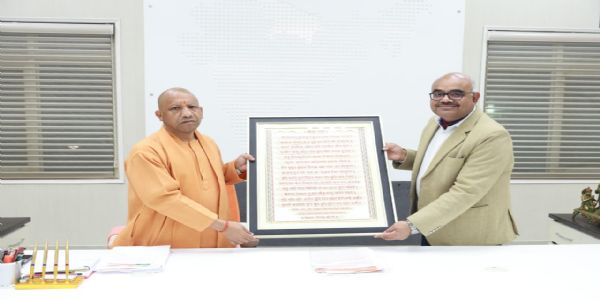 कानपुर, 15 दिसंबर (हि.स.)। जिलाधिकारी जितेंद्र प्रताप सिंह ने सोमवार को लखनऊ में मुख्यमंत्री योगी आदित्यनाथ से भेंट की। इस अवसर पर उन्होंने कानपुर नगर के प्रसिद्ध कैलीग्राफर विजय वर्मा द्वारा ताड़पत्र पर उकेरी गई मर्यादा पुरुषोत्तम भगवान श्रीराम की स्तुति मुख्यमंत्री को भेंट की। ताड़पत्र पर अंकित यह कलाकृति भारतीय परम्परागत लिपि-कला और सांस्कृतिक विरासत का सुंदर उदाहरण है।