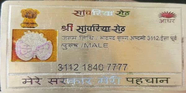 इस अनूठे कार्ड पर भगवान श्रीसांवरिया सेठ का नाम, लिंग (पुरुष) तथा जन्म तिथि के रूप में ‘भाद्रपद कृष्ण अष्टमी 3112 ईसा पूर्व’ अंकित की गई है, जिसे श्रीकृष्ण जन्माष्टमी के रूप में जाना जाता है। इसके साथ ही नाम-पता और आधार नंबर भी कलात्मक शैली में दर्शाए गए हैं। कार्ड के निचले हिस्से में लिखा गया संदेश “मेरे सरकार मेरी पहचान” भक्त और आराध्य के बीच के भावनात्मक संबंध को दर्शाता है।