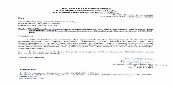 दिल्ली के उपराज्यपाल के सचिव को आईएएस अनीश मुरलीधरन द्वारा हस्ताक्षरित भेजे गए पत्र में कहा गया कि उन्हें यह सूचित करने का निर्देश दिया गया है कि संजीव खिरवार आईएएस को तुरंत प्रभाव से और अगले आदेश तक एमसीडी का आयुक्त नियुक्त करने की मंजूरी दे दी है।