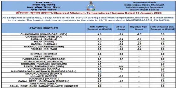 नारनाैल, 10 जनवरी (हि.स.)। हरियाणा में ठंड का प्रकोप बढ़ता ही जा रहा है। शनिवार को जारी भारतीय मौसम विभाग के ताजा आंकडों के अनुसार प्रदेश में महेंद्रगढ़ सबसे ठंडा स्थान रहा। महेंद्रगढ़ में बीती रात को सबसे कम तापमान 1.6 डिग्री सेल्सियस दर्ज किया गया। पिछले चार दिनों से प्रदेशभर में सुबह और रात में ठिठुरन काफी बढ़ी है। उत्तरी पर्वतीय क्षेत्रों से आने वाली सर्द हवाओं ने यहां के तापमान को सामान्य से लगभग 0.9 डिग्री नीचे ला दिया है। जबकि नारनौल का तापमान 3.5 डिग्री किया गया है।