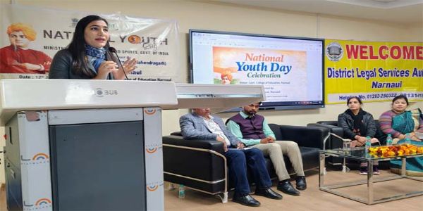नारनाैल, 12 जनवरी (हि.स.)। नारनौल के राजकीय बीएड महाविद्यालय में सोमवार को राष्ट्रीय युवा दिवस बड़े उत्साह के साथ मनाया गया। कार्यक्रम में मुख्य अतिथि के तौर पर मुख्य न्यायिक दंडाधिकारी नीलम कुमारी ने शिरकत की। जबकि अध्यक्ष के तौर पर महाविद्यालय की प्राचार्या डा रेखा कुमारी मौजूद रही। कार्यक्रम में बड़ी संख्या में युवाओं, विभिन्न एनजीओ तथा युवा क्लबों ने भागीदारी की।