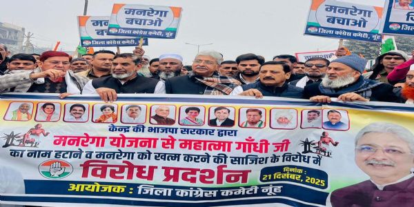 -कांग्रेस प्रदेश अध्यक्ष ने नूंह में कार्यकर्ताओं के साथ किया मनरेगा में बदलाव के विरोध में प्रदर्शन
