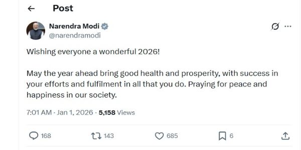 उन्होंने एक्स पर लिखा, '' सभी को 2026 की बहुत-बहुत शुभकामनाएं! प्रधानमंत्री मोदी ने कहा कि आने वाला साल आपके लिए अच्छा स्वास्थ्य और समृद्धि लाए। आपके प्रयासों में सफलता मिले और आप जो भी करें, उसमें आपको संतुष्टि मिले। उन्होंने कहा, ''हमारे समाज में शांति और खुशी के लिए प्रार्थना।''