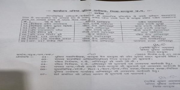 आदेश के अनुसार निरीक्षक प्रदीप जायसवाल को थाना प्रभारी गांधीनगर से हटाकर थाना प्रभारी लुण्ड्रा बनाया गया है, जबकि निरीक्षक प्रवीण कुमार द्विवेदी को रक्षित केंद्र अंबिकापुर से थाना प्रभारी गांधीनगर की जिम्मेदारी सौंपी गई है। उप निरीक्षक संपत पोटाई को थाना अंबिकापुर से स्थानांतरित कर थाना प्रभारी लखनपुर बनाया गया है। वहीं उप निरीक्षक रामनारायण पटेल को थाना प्रभारी लुण्ड्रा से चौकी प्रभारी लुण्ड्रा नियुक्त किया गया है।
