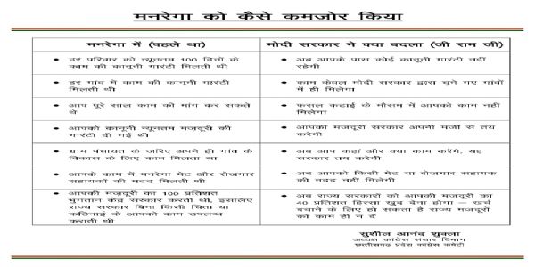 पूर्व मंत्री नोबेल वर्मा ने कहा कि मनरेगा केवल योजना नहीं, बल्कि गरीबों को मिला संवैधानिक अधिकार था। मोदी सरकार ने इस अधिकार को खत्म कर मनरेगा की आत्मा को ही मार दिया है। केंद्र द्वारा हिस्सेदारी घटाकर राज्यों पर बोझ डालना मनरेगा को धीरे-धीरे बंद करने की साजिश है। यह सीधा-सीधा मजदूर विरोधी फैसला है।