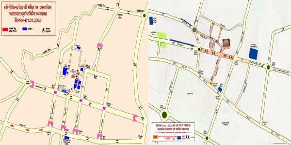गोविंद देव जी मंदिर क्षेत्र में चांदपोल, न्यू गेट, अजमेरी गेट, सांगानेरी गेट, रामगंज चौपड़ एवं जोरावर सिंह गेट से परकोटे में हल्के मालवाहक वाहनों का प्रवेश प्रतिबंधित रहेगा। श्रद्धालु अपने वाहन सौगंध स्टेडियम, जलेबी चौक सब्जी मंडी, जनता मार्केट, जेडीए की भूमिगत पार्किंग तथा रामनिवास बाग में पार्क कर सकेंगे। मंदिर सेवादारों के लिए ग्लोब ट्रांसपोर्ट कंपनी के सामने निर्धारित पार्किंग रहेगी। काले हनुमान जी मंदिर व कंवर नगर की ओर से आने वाले श्रद्धालु झूलेलाल मंदिर के पास खाली भूमि में तथा ब्रह्मपुरी की ओर से आने वाले पांडिक उद्यान के सामने वाहन पार्क कर सकेंगे। पुलिस ने आमजन से अपील की है कि वे नववर्ष के अवसर पर समांतर मार्गों का अधिकाधिक उपयोग करें। यातायात नियमों का पालन करें और सहयोग कर शहर में शांति एवं व्यवस्था बनाए रखने में योगदान दें।