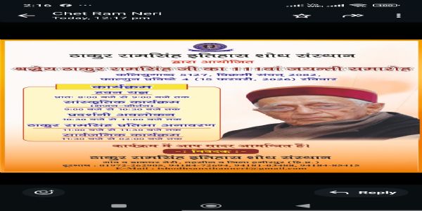 शिमला, 07 जनवरी (हि.स.)। ठाकुर रामसिंह इतिहास शोध संस्थान द्वारा श्रद्धेय ठाकुर रामसिंह की 111वीं जयंती के उपलक्ष्य में समारोह का आयोजन रविवार 15 फरवरी 2026 को किया जा रहा है। यह आयोजन कलियुगाब्द 5127, विक्रमी संवत् 2082, फाल्गुन प्रविष्टे 4 के पावन अवसर पर संपन्न होगा।