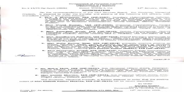 आईएएस अधिकारियों में हमीरपुर के उपायुक्त अमरजीत सिंह को इस पद से हटाकर राज्य सरकार में सहकारिता सचिव बनाया गया है, जबकि विशेष सचिव (कार्मिक) और हिमाचल प्रदेश राज्य हस्तशिल्प एवं हथकरघा निगम की प्रबंध निदेशक का अतिरिक्त प्रभार संभाल रहीं गंधर्वा राठौर को हमीरपुर का नया उपायुक्त नियुक्त किया गया है। शाइनमोल को प्रशासनिक सुधार, प्रशिक्षण एवं एफएंडए तथा आरपीजी विभाग की सचिव नियुक्त किया गया है और वे आयुष सचिव तथा शिमला मंडल की आयुक्त का अतिरिक्त प्रभार भी संभालेंगी। विनोद कुमार को कांगड़ा मंडल से स्थानांतरित कर तकनीकी शिक्षा सचिव बनाया गया है, जबकि वे धर्मशाला में कांगड़ा मंडल आयुक्त का अतिरिक्त कार्यभार जारी रखेंगे। दलीप कुमार नेगी को राज्य कर एवं आबकारी विभाग का विशेष सचिव लगाया गया है और उन्हें उद्योग व गृह विभाग के विशेष सचिव का अतिरिक्त प्रभार भी सौंपा गया है।