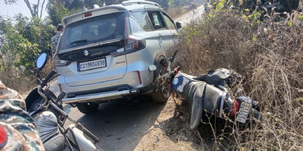 प्राप्त जानकारी के अनुसार कार और मोटरसाइकिल के बीच आमने-सामने की टक्कर हुई। दुर्घटना में माेटरसाइकिल चालक 30 वर्षीय भुनेश्वर साहू, निवासी टेमरी, जिला दुर्ग की मौके पर ही मौत हो गई। माेटरसाइकिल में पीछे बैठी 15 वर्षीय सीमा और उसकी 40 वर्षीय मां गीता, दोनों निवासी जिला धमतरी, गंभीर रूप से घायल हो गईं। प्राथमिक उपचार के बाद उन्हें दुगली शासकीय स्वास्थ्य केंद्र से जिला अस्पताल रेफर किया गया है। जानकारी के अनुसार तीनों नगरी में नहावन कार्यक्रम में शामिल होकर धमतरी की ओर लौट रहे थे। इसी दौरान विपरीत दिशा से तेज रफ्तार कार ने माेटरसाइकिल को टक्कर मार दी।