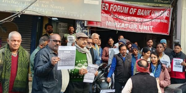 मीरजापुर, 30 दिसंबर (हि.स.)। यूनाइटेड फ़ोरम ऑफ बैंक यूनियंस के राष्ट्रव्यापी आंदोलन के तहत मंगलवार को सार्वजनिक क्षेत्र के सभी बैंक कर्मियों ने केंद्र सरकार के खिलाफ प्रदर्शन किया। पांच दिवसीय बैंकिंग व्यवस्था लागू न किए जाने के विरोध में बैंककर्मियों ने इंडियन बैंक, डंकिनगंज शाखा के सामने धरना देकर सभा की और सरकार से अपनी लंबित मांगें शीघ्र पूरी करने की अपील की। फ़ोरम के जिला संयोजक सुरेश पाण्डेय ने कहा कि पांच दिवसीय बैंकिंग की मांग लंबे समय से लंबित है। सरकार ने इस संबंध में आश्वासन दिया था, लेकिन अब तक इसे लागू नहीं किया गया है।