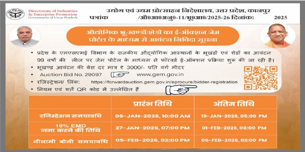 जिला उद्योग केंद्र के संयुक्त आयुक्त वीरेंद्र कुमार सिंह ने बताया कि उत्तर प्रदेश सरकार ने राज्य में औद्योगिक निवेश को नई गति देने की दिशा में एक बड़ा और निर्णायक कदम उठाया है। उद्योग एवं उद्यम प्रोत्साहन निदेशालय उत्तर प्रदेश (कानपुर) की ओर से राजकीय औद्योगिक आस्थानों में उपलब्ध औद्योगिक भू-खंडों और शेडों का आवंटन अब जेम पोर्टल के माध्यम से ई-ऑक्शन प्रक्रिया द्वारा किया जाएगा।