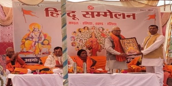 मीरजापुर, 20 दिसम्बर (हि.स.)। हलिया विकास खंड के कस्बे में शनिवार को आयोजित हिंदू सम्मेलन आस्था, इतिहास और संगठन के संदेशों से गूंज उठा। दीप प्रज्ज्वलन, राष्ट्रगान और यज्ञ आहुति के साथ सम्मेलन का शुभारम्भ हुआ। भगवान राम, हनुमान और भारत माता के चित्रों पर माल्यार्पण के बाद अतिथियों का पारम्परिक स्वागत किया गया। शांति निकेतन स्कूल की छात्रा की गीत-नृत्य प्रस्तुति ने कार्यक्रम में रंग भर दिया।