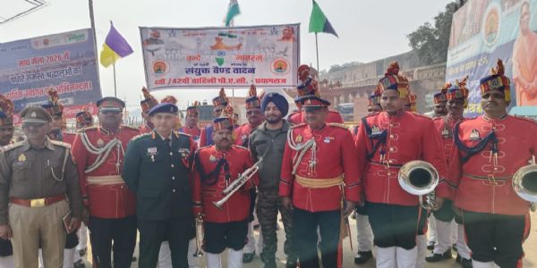 प्रयागराज, 15 जनवरी (हि.स.)। संगमनगरी के ऐतिहासिक किले के तोरण द्वार पर वंदे मातरम की 150वीं वर्षगांठ के उपलक्ष्य मे पी ए सी की 42वीं वाहिनी ने वंदे मातरम की धुन पर संयुक्त बैंड वादन कर त्रिवेणी की तीन धाराओं के बीच देशभक्ति की चौथी मधुर धारा प्रवाहित कर मेले में आये श्रद्धालुओं का ध्यान अपनी ओर बरबस खींच लिया।