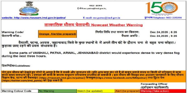 बुधवार को राज्य के सभी जिलों में कोल्ड डे की स्थिति बने रहने के साथ पांच जिलों खगड़िया, भागलपुर, मुंगेर, जमुई, बांका में घना कोहरा की चेतावनी जारी की गई है। आज 25 जिले कोल्ड डे और घने कोहरे की चपेट में रहेंगे। 12 जिलों में ऑरेंज अलर्ट और 13 में यलो अलर्ट है। 28 दिसंबर तक घने कोहरे और शीतलहर का पूर्वानुमान है।