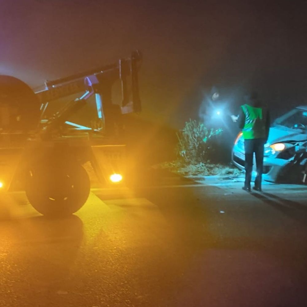 घनी धुंध में डिवाइडर पर चढ़ी कार, चालक बाल-बाल बचा:हादसे में कार का अगला टायर फटा,रिकवरी वैन से कार को टो कर रस्ता साफ किया